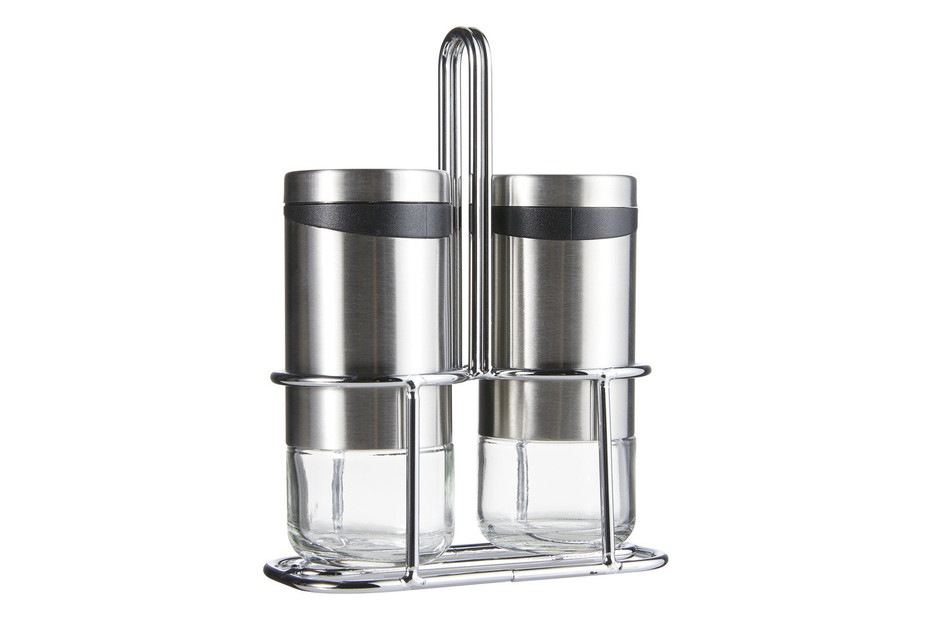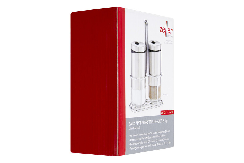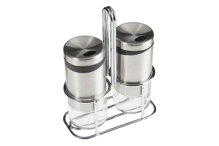 Set doua recipiente sare si piper cu suport Zeller, sticla/otel inoxidabil, 5x11 cm, 220 ml, argintiu