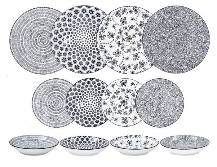 • Acest set de veselă din porțelan pentru 4 meseni este compus din farfurii adânci, plate și pentru desert și oferă 4 modele diferite și elegante pentru o masă armonioasă prin combinație de culori și design, diametrele farfuriilor fiind de 19, 20 si 27 cm.